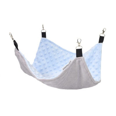 Hamak dla gryzonia 35x40cm z serii Candy na elastycznej taśmie z 4 karabińczykami. Jest to idealny mebel dla gryzonia. Dzięki prostokątnej formie i większym rozmiarom znajdzie zastosowanie w większej klatce. Hamak w klatce dla gryziona to idealne miejsce na sen i zabawę. By ułatwić montaż i demontaż, hamak wyposażony jest w 4 karabińczyki. Wykorzystanie oraz mocowanie hamaku dowolne, jednak jeśli hamak zostanie powieszony odpowiednio nisko od podłogi, spełni on dodatkową funkcję norki. Taśmy amortyzują hamak, dzięki czemu są wytrzymalsze i bezpieczniejsze. Materiał podstawy to przyjemny w dotyku plusz, natomiast górna tkanina to błękitny plusz z mięciutkimi wypustkami.