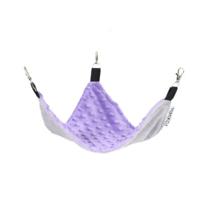 Hamak dla gryzonia trójkątny z serii Candy na elastycznej taśmie z 3 karabińczykami. Idealnie sprawdzi się w małej klatce, w której każdy centymetr jest na wagę złota. Trójkątna forma zapewni miejsce do odpoczynku pupila i nie zajmie dużo miejsca. Karabińczyki pozwalają szybko i w prosty sposób zamontować i zdemontować hamak. Dodatkowo umożliwiają dowolną konfigurację hamaka. Warto powiesić hamak dla gryzoni stosunkowo nisko od podłoża. Spełni on wtedy dodatkową funkcję nory. Taśmy mają za zadanie amortyzować hamak w celu zapewnienia bezpieczeństwa pupilowi i wydłużyć żywotność materiałów. Materiał od spodu to przyjemny w dotyku plusz, natomiast górna tkanina to błękitny plusz z mięciutkimi wypustkami.
