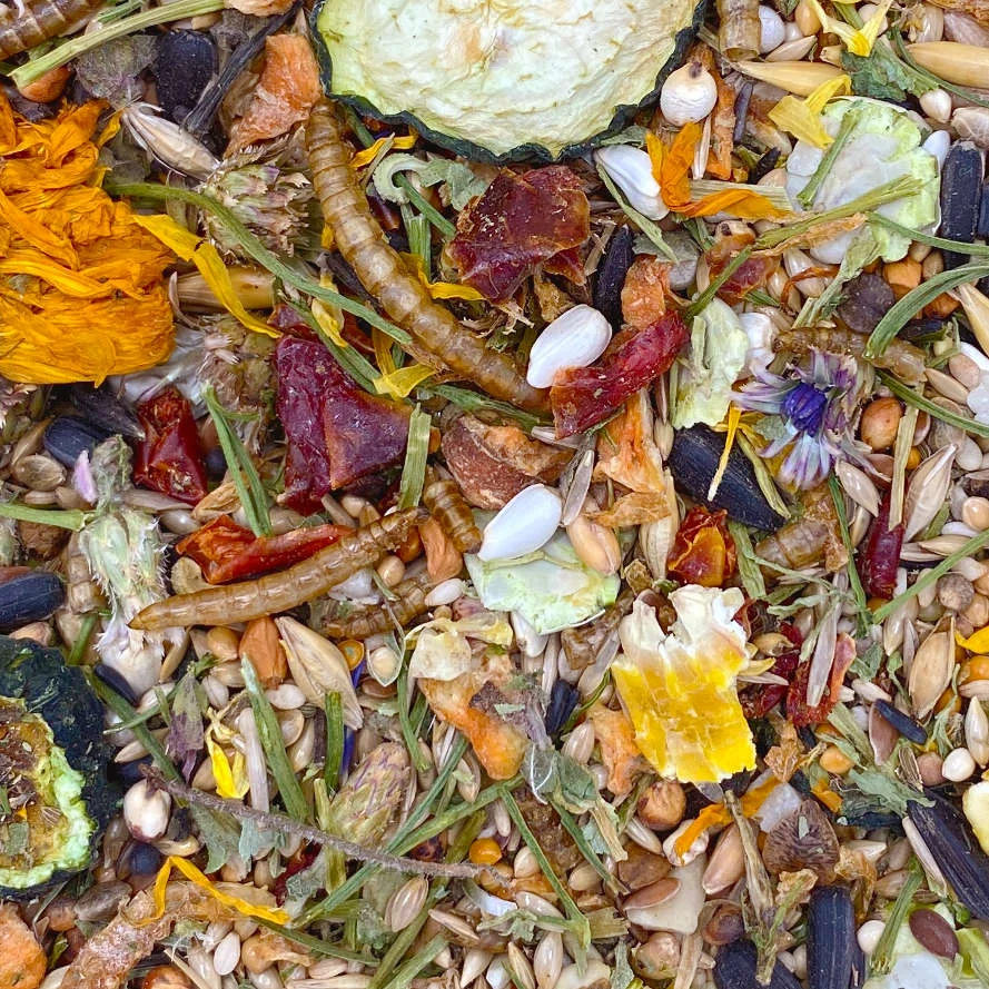 Skład: nasiona kanaryjskie, nasiona sezamu, cardi, siemię lniane, nasiona niger, nasiona chwastów, nasiona marchwi, proso srebrne, proso platah, proso czerwone, dari, milo, mącznik mącznika, nasiona słonecznika, nasiona dyni, orzeszki ziemne, gryka, nasiona traw, nasiona konopi, pomidory, plastry ogórka, papryka czerwona, żyto, płatki owsiane, owoce dzikiej róży, płatki kukurydziane, płatki grochu, kwiaty nagietka, kwiaty bławatka, łodygi pietruszki, rdest ptasi, liście melisy, krewetki słodkowodne.