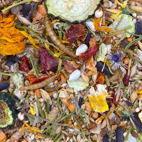 ✅ Zróżnicowany skład – zawiera nasiona, rośliny strączkowe, warzywa, kwiaty i białko zwierzęce