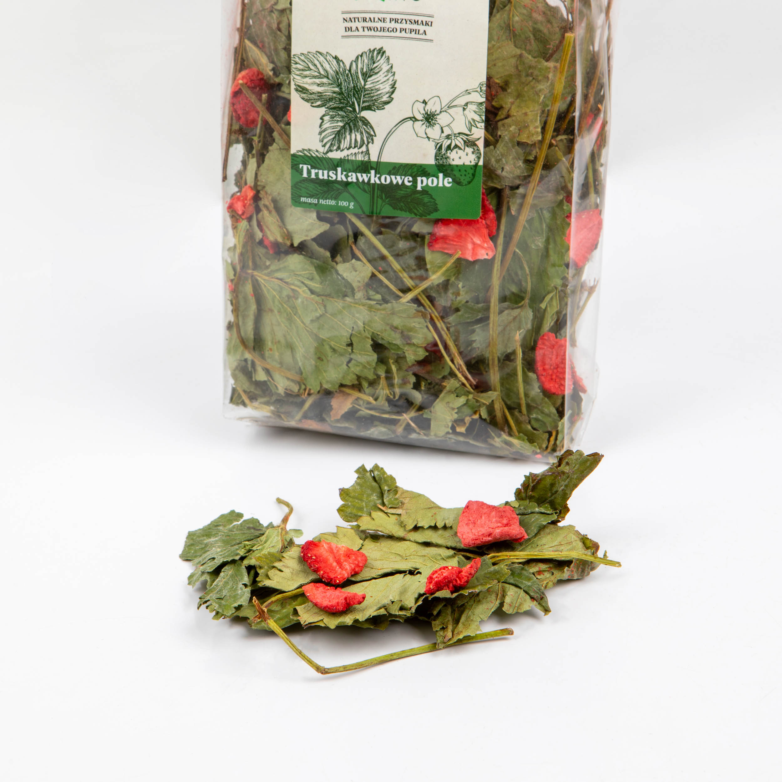 Aromatyczne liście truskawki z dodatkiem plasterków liofilizowanej truskawki. Naturalna, lekka i pachnąca przekąska — „bratni" produkt Marchewkowego Pola. Mieszanka suszonych liści truskawki z dodatkiem chrupiących plastrów liofilizowanej truskawki. Bardzo smakowita propozycja, która urozmaici dietę Twojego pupila